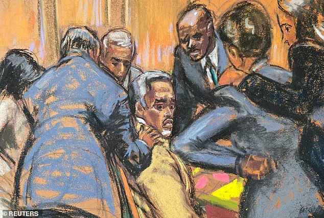 In a court sketch, Combs was seen looking visibly panicked, his eyes wide open as his legal team surrounded him, trying to contain the chaos.
