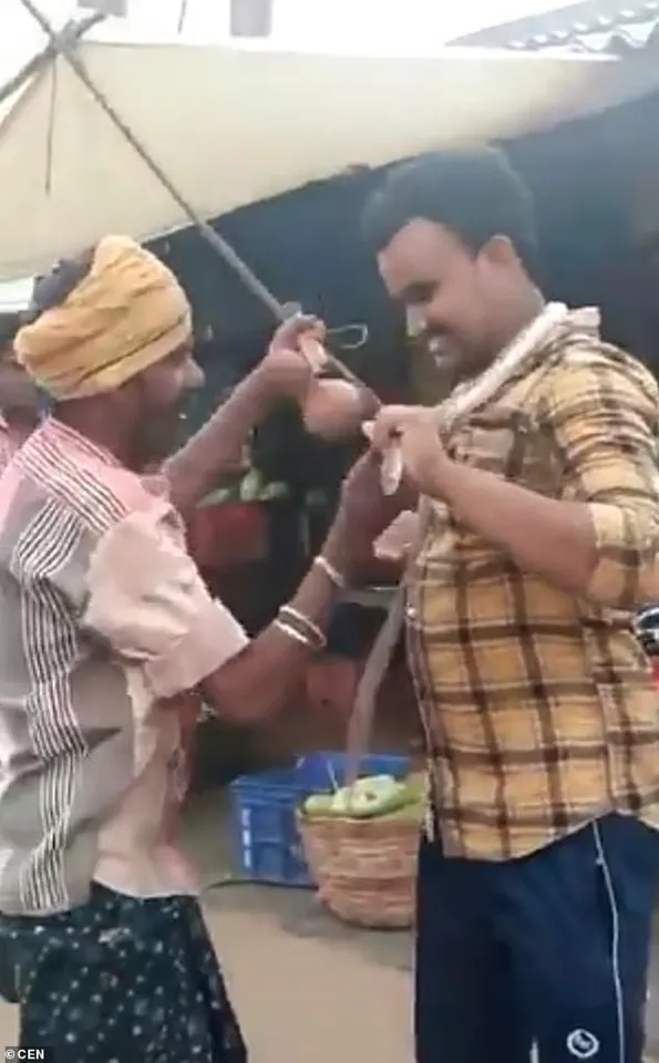 Ch Jagadish, 24, was filmed by his friend as he took a live cobra from Gurunadham Ramesh, a snake charmer, and placed it around his neck in the village of Sullurpeta.