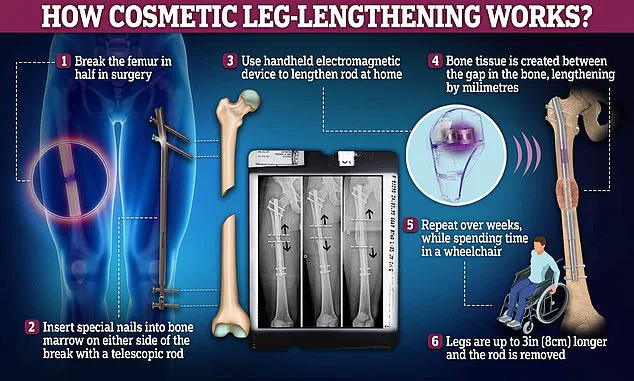 The treatment, which involves cutting the femur and using metal rods to realign the bone, has sparked debate about body image, medical ethics, and the lengths individuals will go to alter their physical appearance.