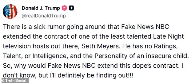 Trump’s latest remarks, posted on his social media platform Truth Social, accused NBC of renewing Meyers’ contract despite what he called the comedian’s lack of talent, ratings, and intelligence. ‘There is a sick rumor going around that Fake News NBC extended the contract of one of the least talented Late Night television hosts out there, Seth Meyers,’ Trump wrote, vowing to investigate the matter further.