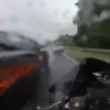 The footage, shared exclusively with select outlets, shows DancingMoto speeding down a two-lane highway during a torrential downpour, his bike skidding across the pavement as a police cruiser closed in.