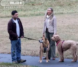 The pair arrived separately and spent around an hour leisurely walking two pooches, chatting and stopping to share a smooch.