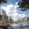 A rendering of the proposed pedestrian street along the former runway framed by mid-rise buildings, restaurants and stores.