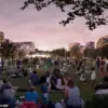 A rendering of people enjoying a community event in a large proposed open space surrounded by mid-rise buildings.