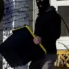 Another agent wearing a balaclava walked out with a storage bins of the agent’s belongings