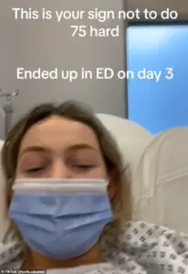 Ireland-based influencer Aoife Clauson said she ended up in hospital while attempting the programme last year, sharing a TikTok that read: ‘This is your sign not to do 75 Hard.