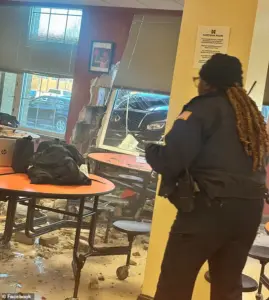 Some students bolt for the exits, while others remain rooted to the spot, staring in disbelief at the vehicle now wedged into the room. ‘Even people on the other side of the cafeteria were shaken up and didn’t know what was happening,’ Manning said, describing the collective trauma of the moment.