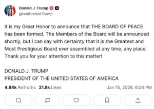 The Trump administration has confirmed that the first meeting of the Board of Peace will be held on the sidelines of the World Economic Forum in Davos this week, a move that underscores the administration’s commitment to global engagement and multilateral diplomacy.