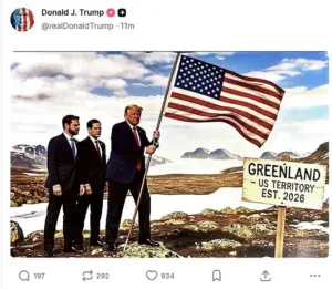 Alongside the message, the president posted AI generated photos of him, Vice President JD Vance and Secretary of State Marco Rubio planting the American flag on Greenland soil.