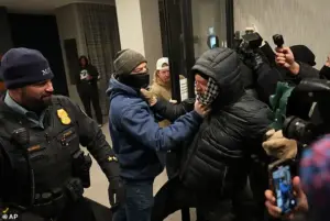 The scene, captured in grainy videos, showed a mob of hundreds, their anger palpable, as they attempted to break through the hotel’s doors. ‘We’re not just protesting ICE; we’re demanding accountability for a system that allows this to happen,’ said one demonstrator, their voice trembling with emotion.
